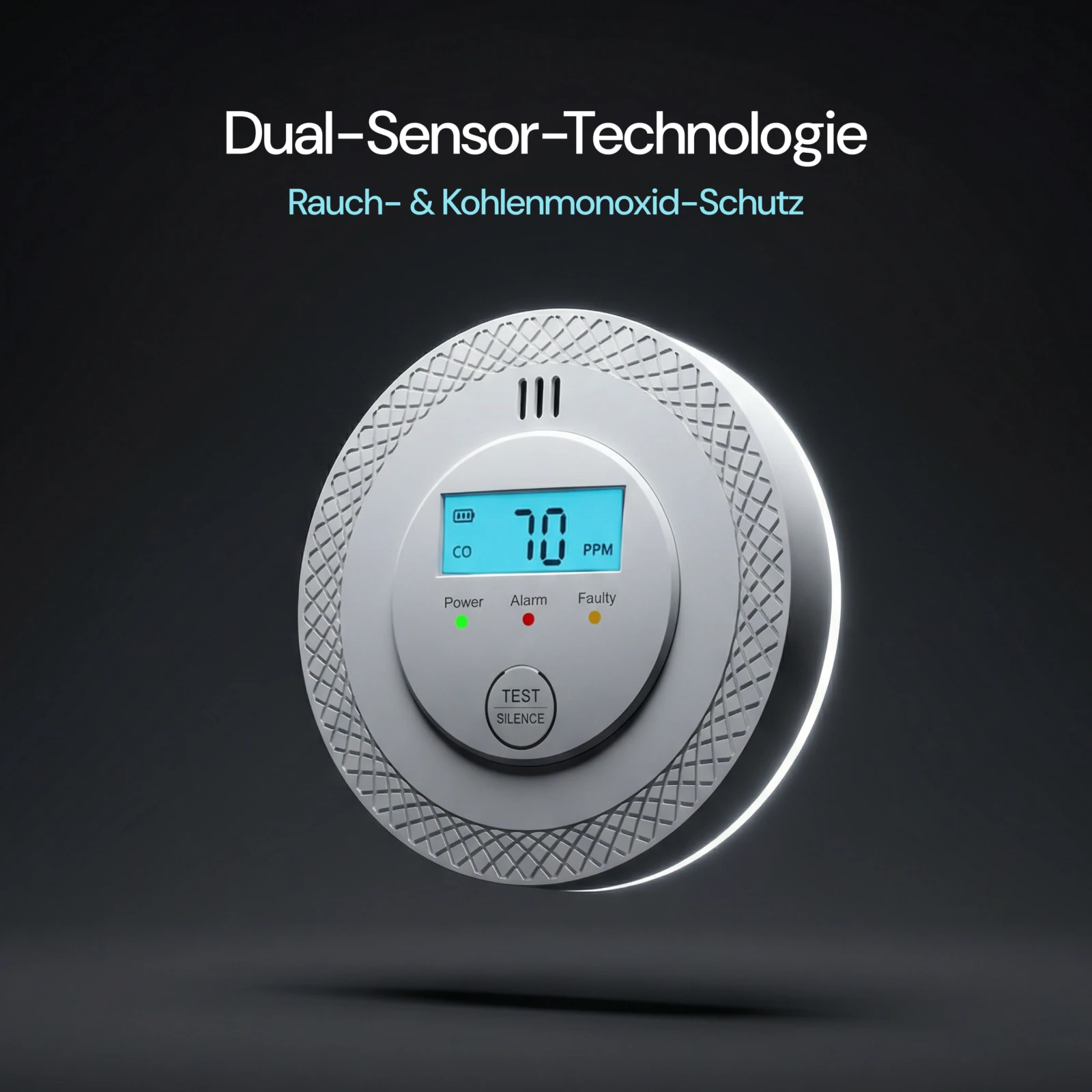 COalarm™ nutzt moderne Doppel-Sensoren, um sowohl Rauch als auch Kohlenmonoxid zu erkennen. Sobald Gefahr erkannt wird, ertönt ein extrem lauter 120-dB-Alarm und der aktuelle CO-Wert wird auf dem digitalen Display angezeigt – so erhalten Sie sofort akustische und visuelle Warnungen.